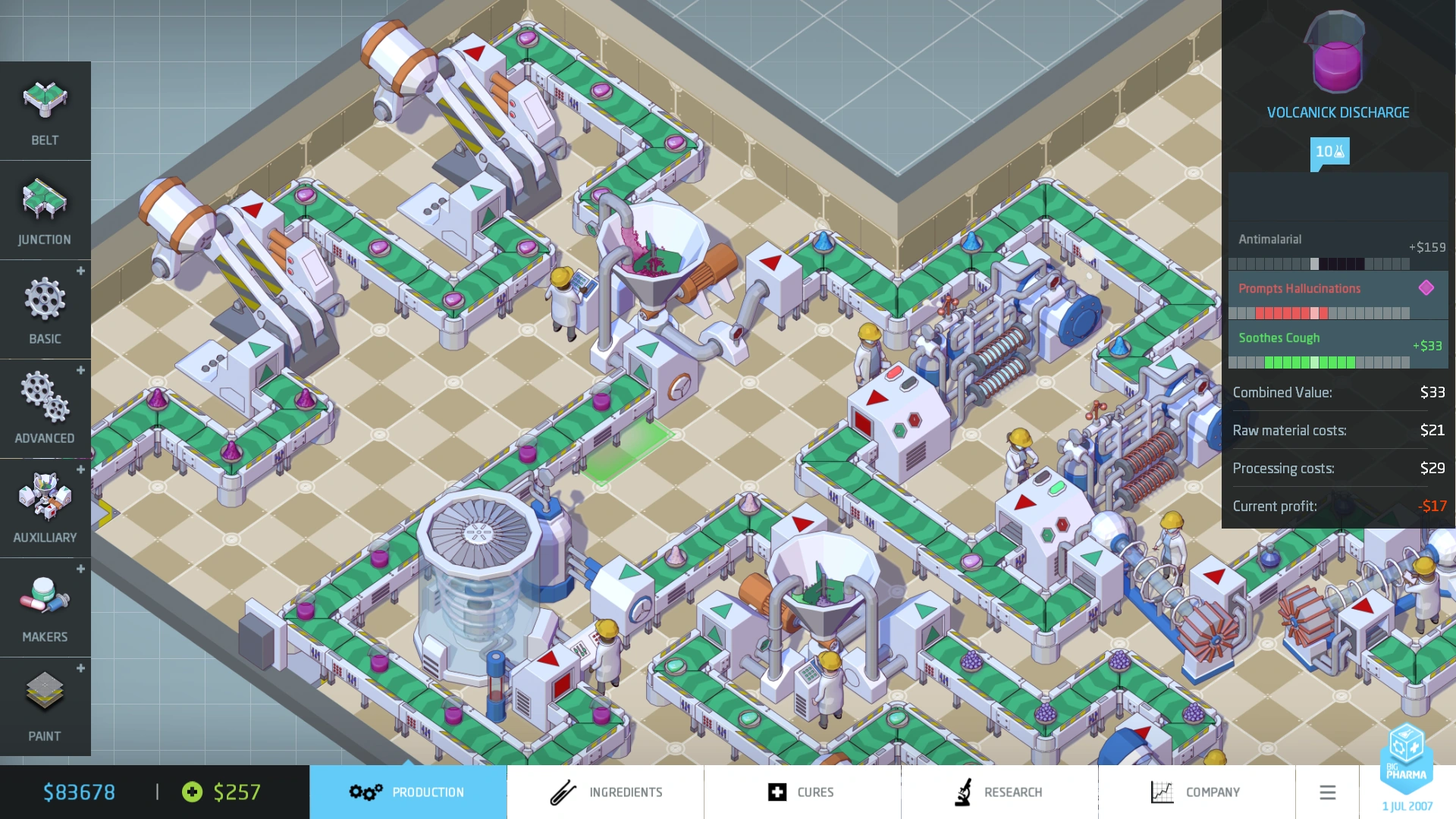 From humble beginnings with a few rusty reconditioned Machines, you can progress from knocking out cheap generic treatments for minor ailments, to discovering new active ingredients and hi-tech machines to help refine the next generation of world-changing drugs. But watch out, you’re not alone out there. Rival Corporations that want to put you out of business have their own set of competing cures and treatments. Then there’s the dynamically shifting marketplace which means that your fancy cold and flu medicine from last winter might not sell so well now it’s the height of summer. Where did I put my anti-wrinkle sun cream?